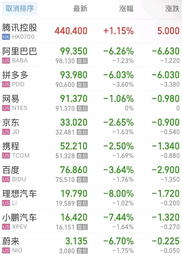 热门中概股方面,腾讯控股(港股)涨1.15%,阿里巴巴跌6.26%,拼多多跌6.03%,网易跌1.06%,携程跌2.50%,百度跌3.64%,理想汽车跌8.00%,小鹏汽车跌7.44%,蔚来跌6.70%。