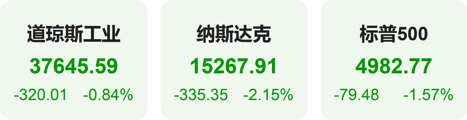 截至收盘,道琼斯指数跌0.84%,报37,645.59点;标普500指数跌1.57%,报4,982.77点,自去年4月以来首次收于5,000点下方;纳斯达克综合指数跌2.15%,报15,267.91点。