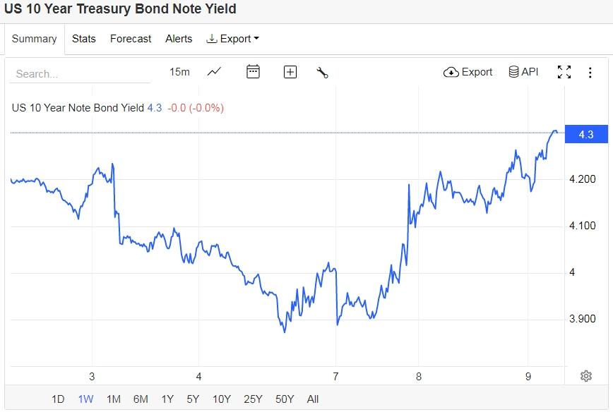 美债收益率继续攀升,基准的10年期美债收益率收报4.304%;对货币政策更敏感的两年期美债收益率收报3.738%。
