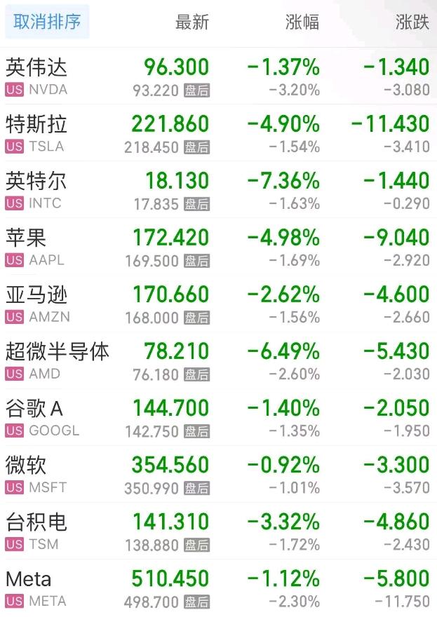 热门美股中,微软跌0.92%,苹果跌4.98%,英伟达跌1.37%,亚马逊跌2.63%,谷歌C跌1.78%,谷歌A跌1.40%,Meta跌1.12%,台积电跌3.33%,特斯拉跌4.90%,超微半导体跌6.49%。