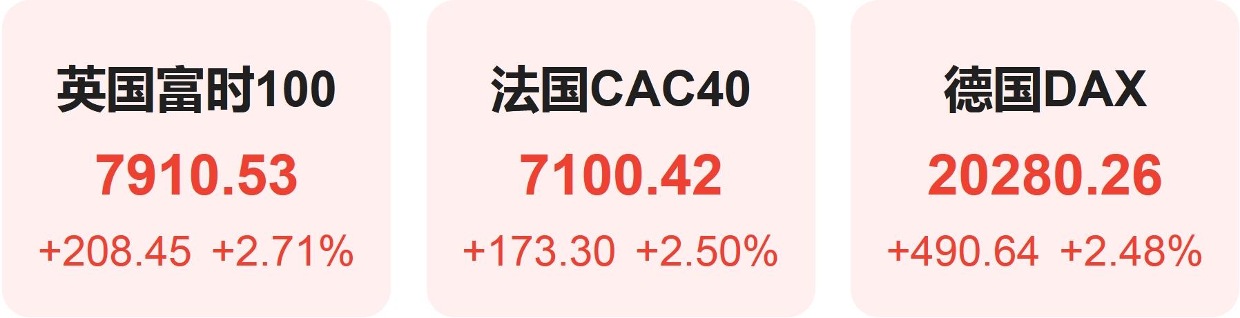 欧洲股市方面,英国富时100指数大涨2.71%,报7911点。法国CAC40指数大涨2.50%,报7100点。德国DAX指数大涨2.48%,报20280点。