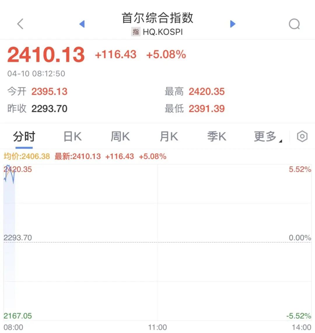 韩国KOSPI指数涨超5%,报2410.13点。韩国KOSPI 200期货上涨5%,韩国交易所因此启动临时停牌机制,并暂停程序化交易5分钟。