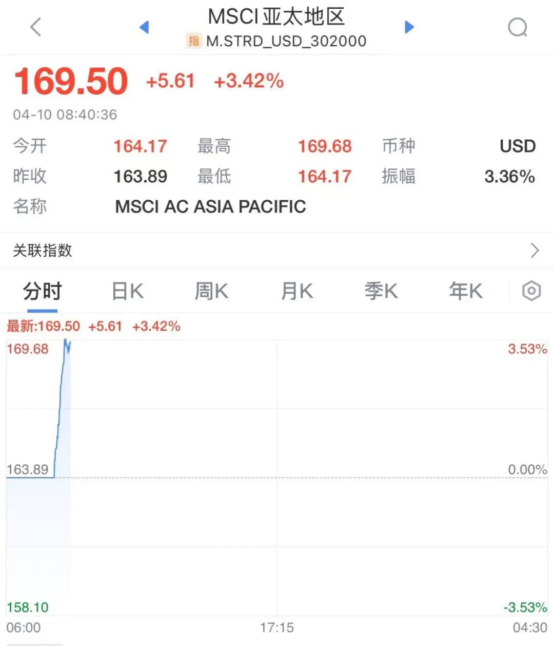 此外,MSCI亚太指数上涨3.42%至169.50点。
