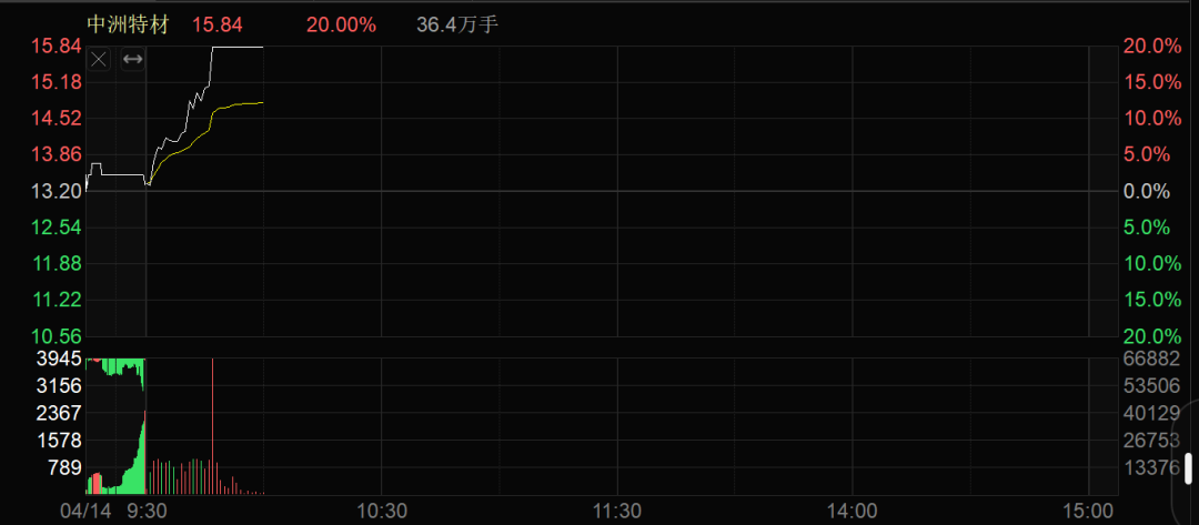 有色金属板块拉升,中洲特材(300963)20%涨停,威领股份(002667)涨停。怡球资源(601388)、湖南黄金(002155)涨逾8%,盛达资源(000603)、华钰矿业(601020)等涨幅居前。