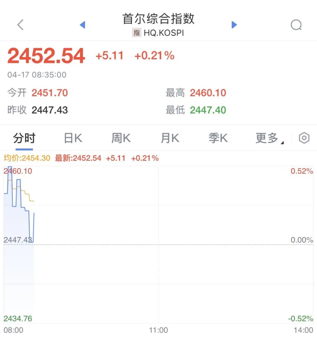 此外,韩国股市小幅调整,截至发稿,韩国KOSPI指数涨0.21%。