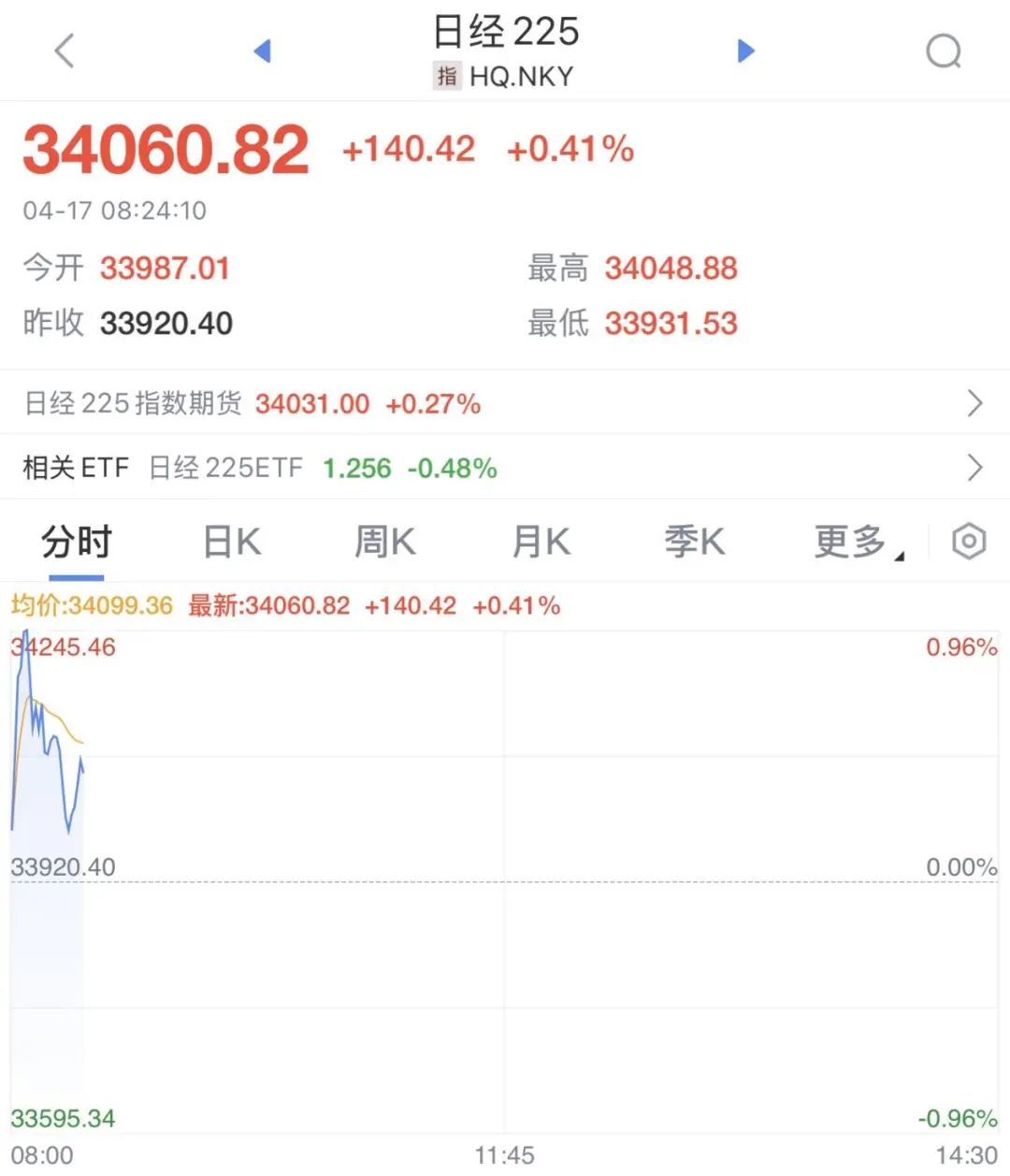 4月17日早间,日本股市短线拉升,日经225指数涨幅一度扩大至1%,随后震荡调整。