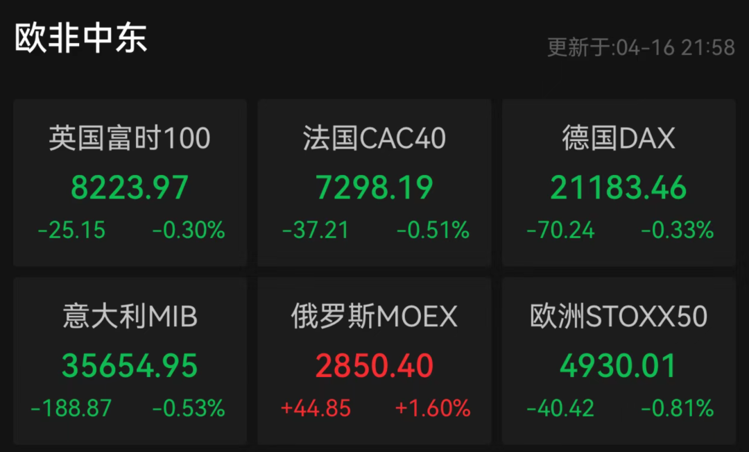 欧洲股市集体下跌,德国DAX指数跌0.33%,法国CAC40指数跌0.51%,英国富时100指数跌0.30%。