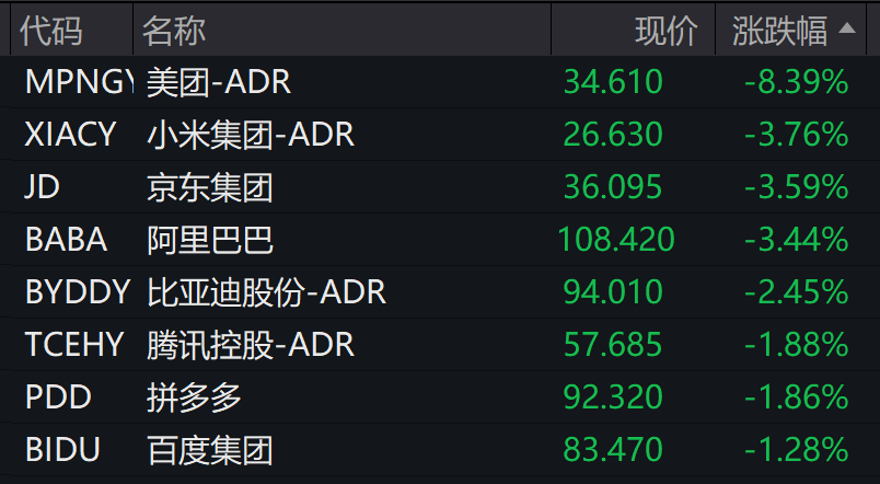 个股方面,美团跌超8%,京东集团跌超3.5%,阿里巴巴、小米集团跌超3%。
