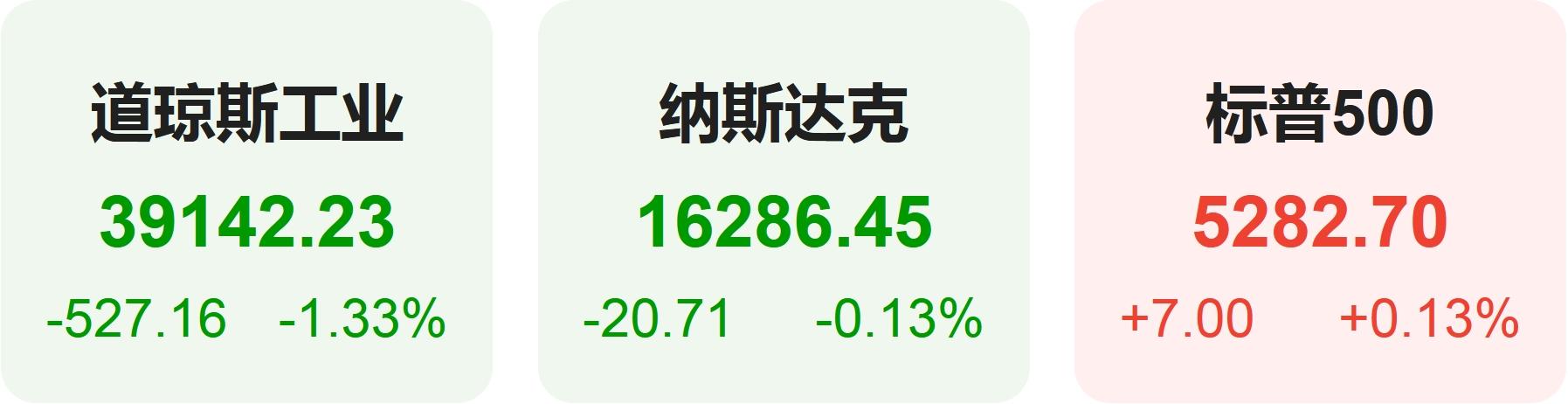 截至收盘,标普500指数涨0.13%,报5282.70点;道琼斯指数跌1.33%,报39142.23点;纳斯达克指数跌0.13%,报16286.45点。