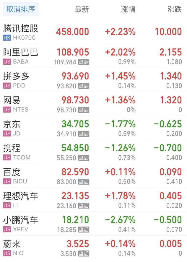 热门中概股方面,腾讯控股(港股)涨2.23%,阿里巴巴涨2.02%,拼多多涨1.45%,网易涨1.36%,携程跌1.26%,百度涨0.11%,理想汽车涨1.78%,小鹏汽车跌2.67%,蔚来涨0.14%。