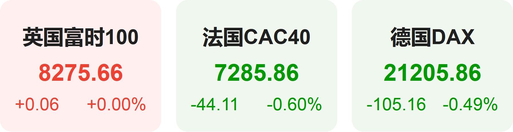 欧洲股市方面,英国富时100指数小幅上涨0.00%,报8276点。法国CAC40指数小幅下跌0.60%,报7286点。德国DAX指数小幅下跌0.49%,报21206点。
