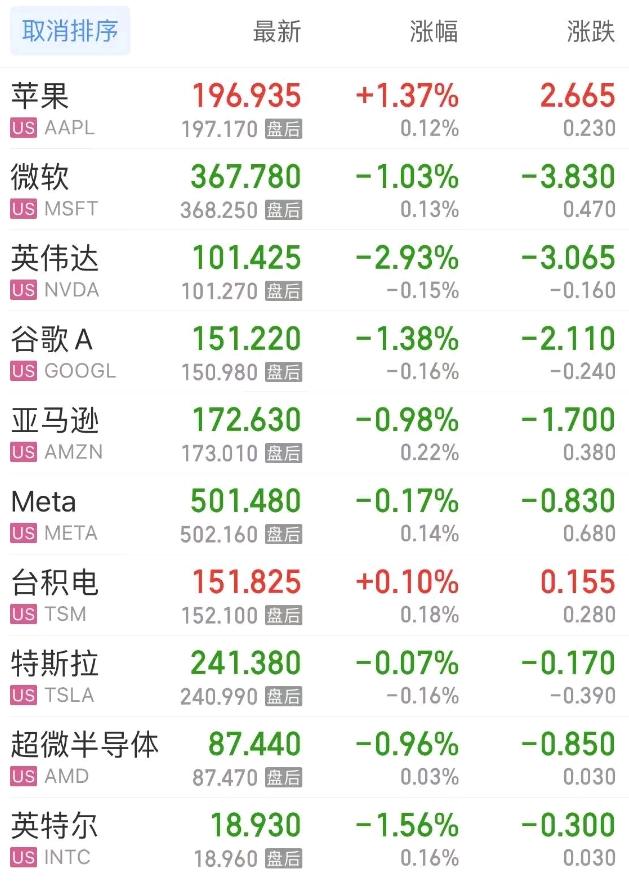热门美股中,苹果涨1.37%,微软跌1.03%,英伟达跌2.93%,谷歌C跌1.38%,谷歌A跌1.38%,亚马逊跌0.98%,Meta跌0.17%,台积电涨0.10%,特斯拉跌0.07%,超微半导体跌0.96%。
