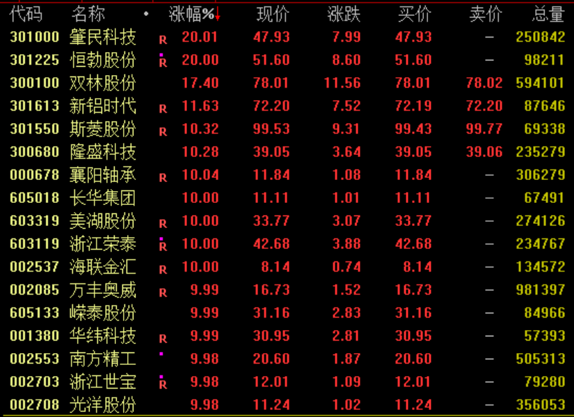 场内近3200股飘红,汽车产业链股爆发,肇民科技(301000)、恒勃股份(301225)、襄阳轴承(000678)等涨停,双林股份(300100)再创新高;人形机器人概念再度活跃,万达轴承、东土科技(300353)等大涨;消费电子概念拉升,卓翼科技(002369)、芯瑞达(002983)、春秋电子(603890)等涨停;黄金概念股回落,明牌珠宝(002574)、赤峰黄金(600988)跌停,四川黄金(001337)跌超9%;食品饮料股走低,麦趣尔(002719)、安记食品(603696)、庄园牧场(002910)等跌停;此外,国芳集团(601086)、国光连锁(605188)、红宝丽(002165)等高位股集体跳水跌停。