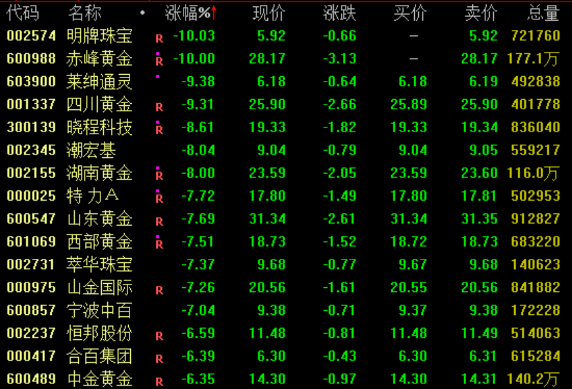黄金概念今日大幅回调,截至收盘,明牌珠宝、赤峰黄金跌停,莱绅通灵(603900)、四川黄金跌超9%,湖南黄金(002155)跌8%,山东黄金(600547)、西部黄金(601069)跌超7%。