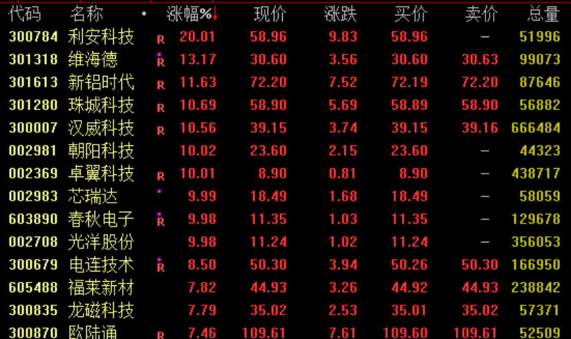 消费电子概念盘中发力走高,截至收盘,利安科技(300784)20%涨停,汉威科技(300007)涨超10%,朝阳科技(002981)、卓翼科技、芯瑞达、春秋电子等均涨停。