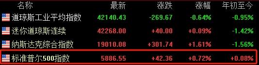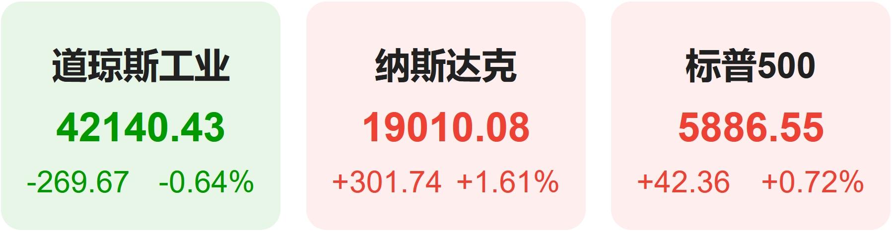 截至收盘,标普500指数涨0.72%,报5886.55点,收于3月初以来的最高水平,年内变化由跌转涨,现累涨0.08%,该指数今年一度累跌超17%;道琼斯指数跌0.64%,报42140.43点;纳斯达克指数涨1.61%,报19010.08点,上一次收于1.9万点上方还是在2月26日。