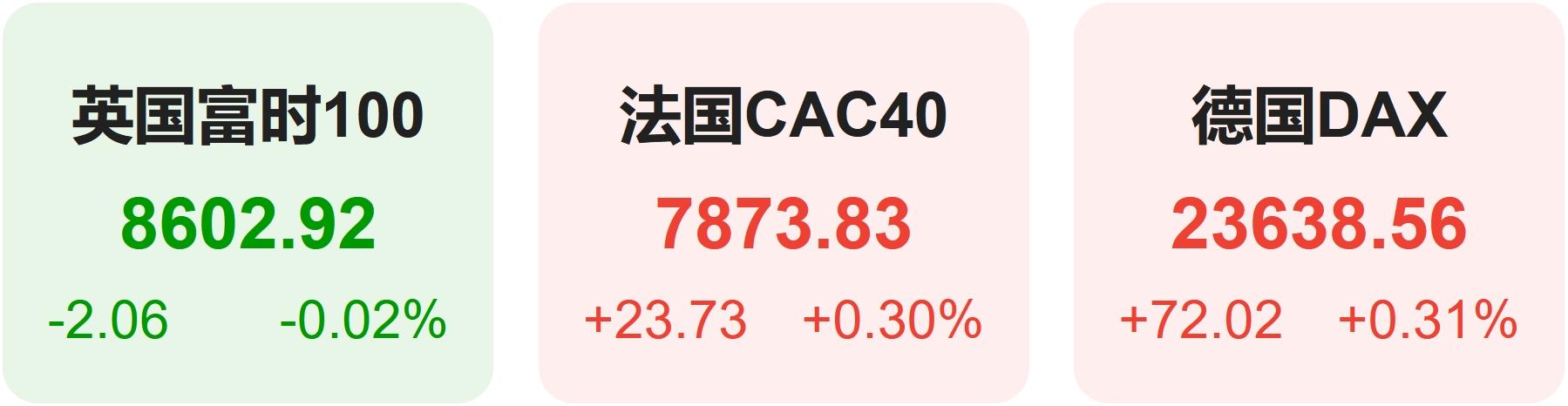 欧洲股市方面,英国富时100指数小幅下跌0.02%,报8603点。法国CAC40指数小幅上涨0.30%,报7874点。德国DAX指数小幅上涨0.31%,报23639点。