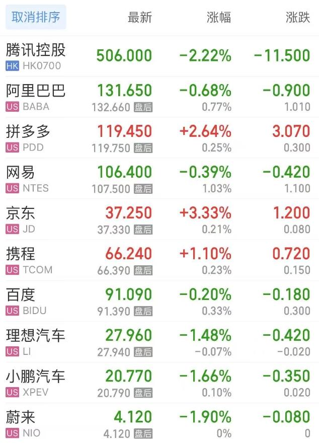 热门中概股方面,腾讯控股(港股)跌2.22%,阿里巴巴跌0.71%,拼多多涨2.64%,网易跌0.39%,携程涨1.10%,百度跌0.20%,理想汽车跌1.48%,小鹏汽车跌1.71%,蔚来跌1.79%。