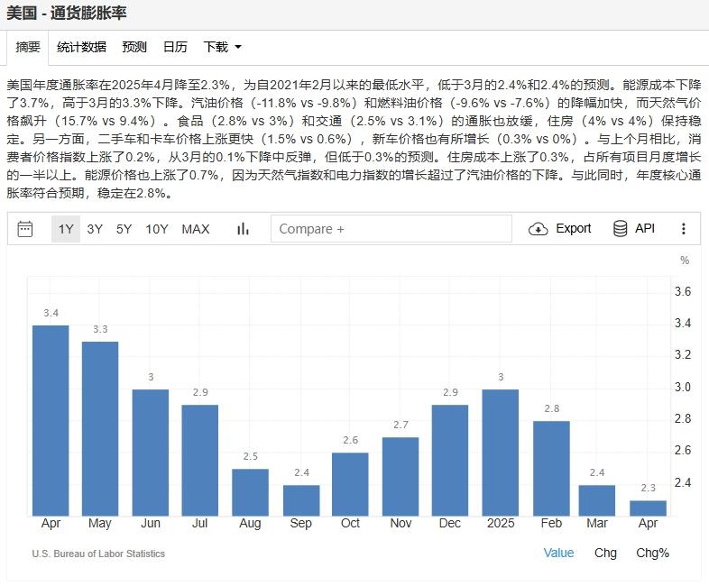 美国通胀降温4月CPI同比2.3% 为自2021年2月以来最低水平