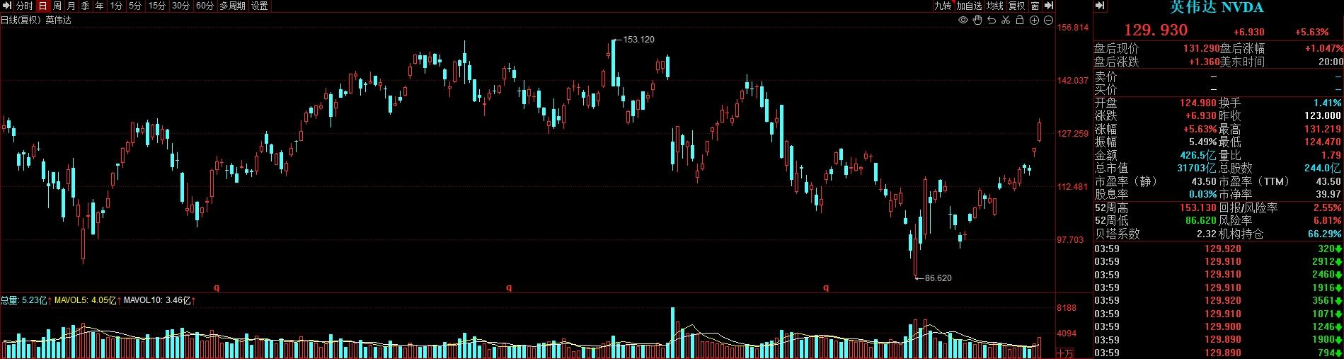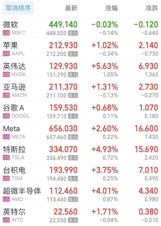 热门美股中,微软跌0.03%,苹果涨1.02%,英伟达涨5.63%,亚马逊涨1.31%,谷歌C涨0.82%,谷歌A涨0.68%,Meta涨2.60%,特斯拉涨4.93%,台积电涨3.74%,超微半导体涨4.01%。