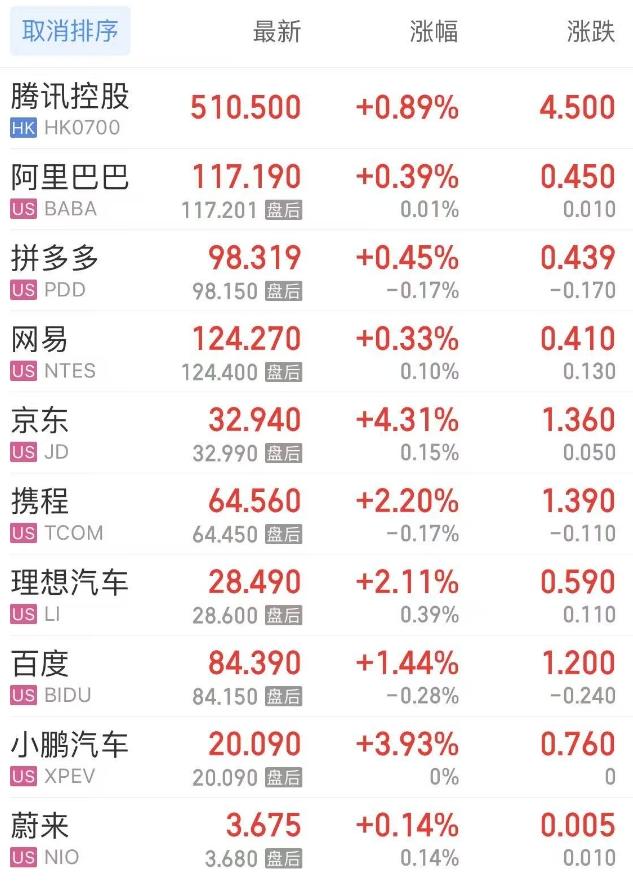 热门中概股方面,腾讯控股(港股)涨0.89%,阿里巴巴涨0.39%,拼多多涨0.45%,网易涨0.33%,携程涨2.20%,理想汽车涨2.12%,百度涨1.44%,小鹏汽车涨3.93%,蔚来涨0.14%。