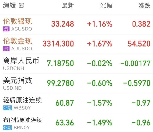 现货黄金先跌后涨,伦敦金收涨1.68%,报3314.53美元/盎司。伦敦银收涨1.18%,报33.254美元/盎司。