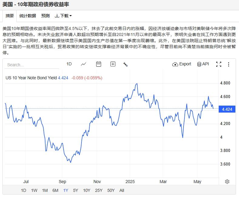 美债收益率下跌,基准的10年期美债收益率收报4.424%;对货币政策更敏感的两年期美债收益率收报3.947%。