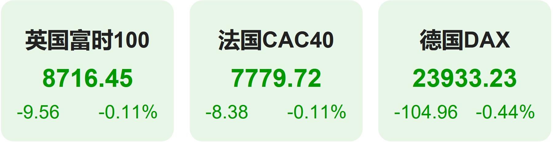 欧洲股市方面,英国富时100指数小幅下跌0.11%,报8716点。法国CAC40指数小幅下跌0.11%,报7780点。德国DAX指数小幅下跌0.44%,报23933点。