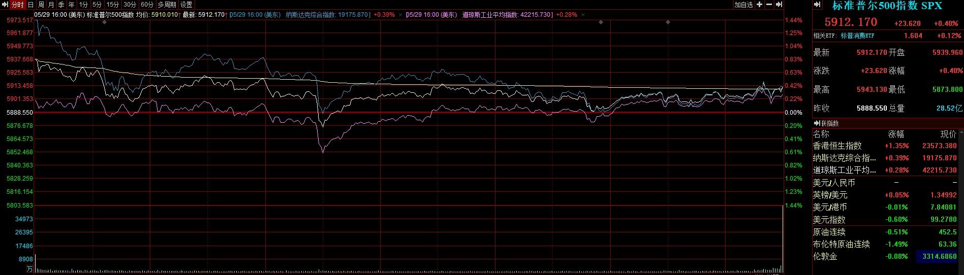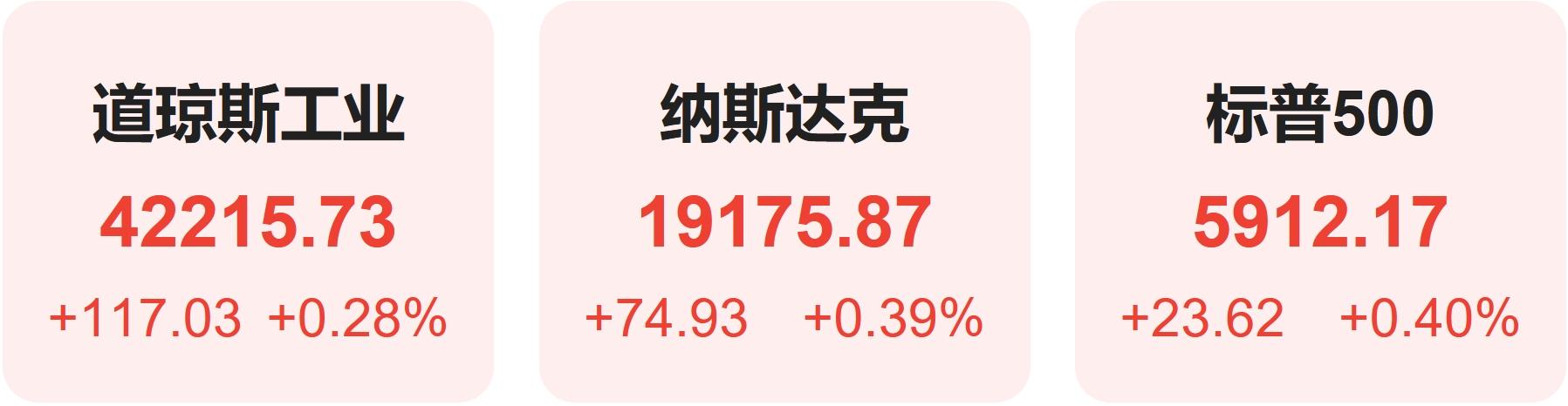 截至收盘,标普500指数涨0.40%,报5912.17点;道琼斯指数涨0.28%,报42215.73点;纳斯达克指数涨0.39%,报19175.87点。
