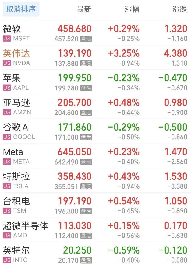 热门美股中,微软涨0.29%,英伟达涨3.25%,苹果跌0.24%,亚马逊涨0.48%,谷歌C跌0.24%,谷歌A跌0.29%,Meta涨0.23%,特斯拉涨0.43%,台积电涨0.54%,超微半导体涨0.15%。