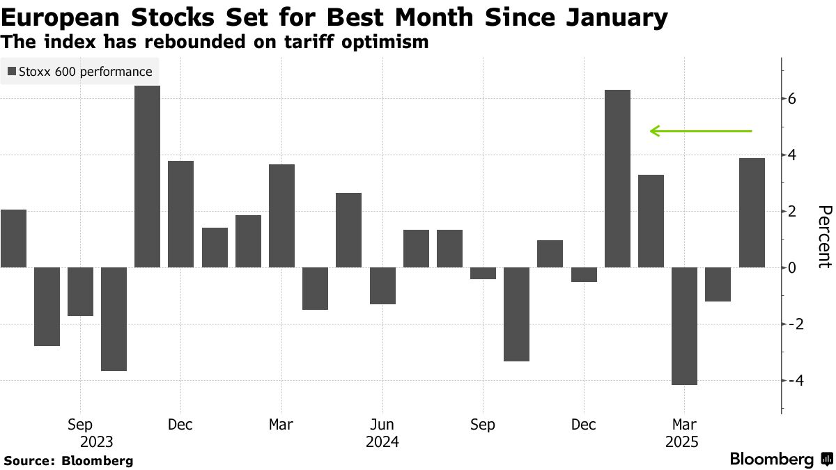 在投资者密切关注全球贸易局势前景之际,欧洲股市有望创下今年1月以来的最大单月涨幅。截至发稿,泛欧斯托克600指数涨0.50%,本月以来已累计上涨4.4%。