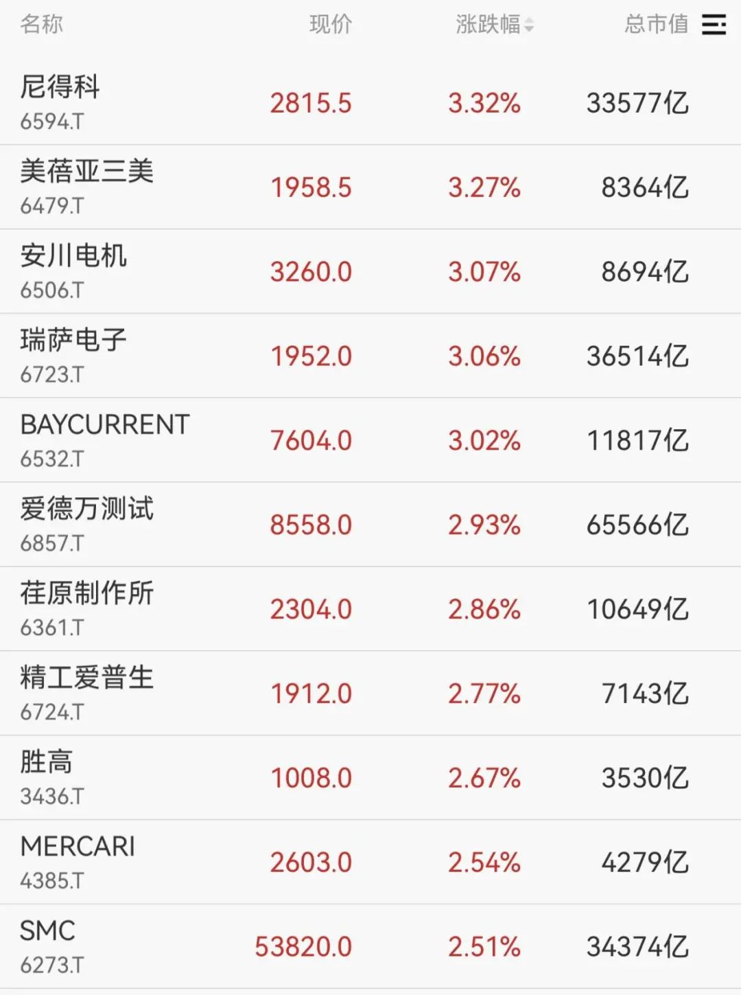 从个股来看,电子类股票领涨,美蓓亚三美、瑞萨电子、爱德万测试等涨幅居前。