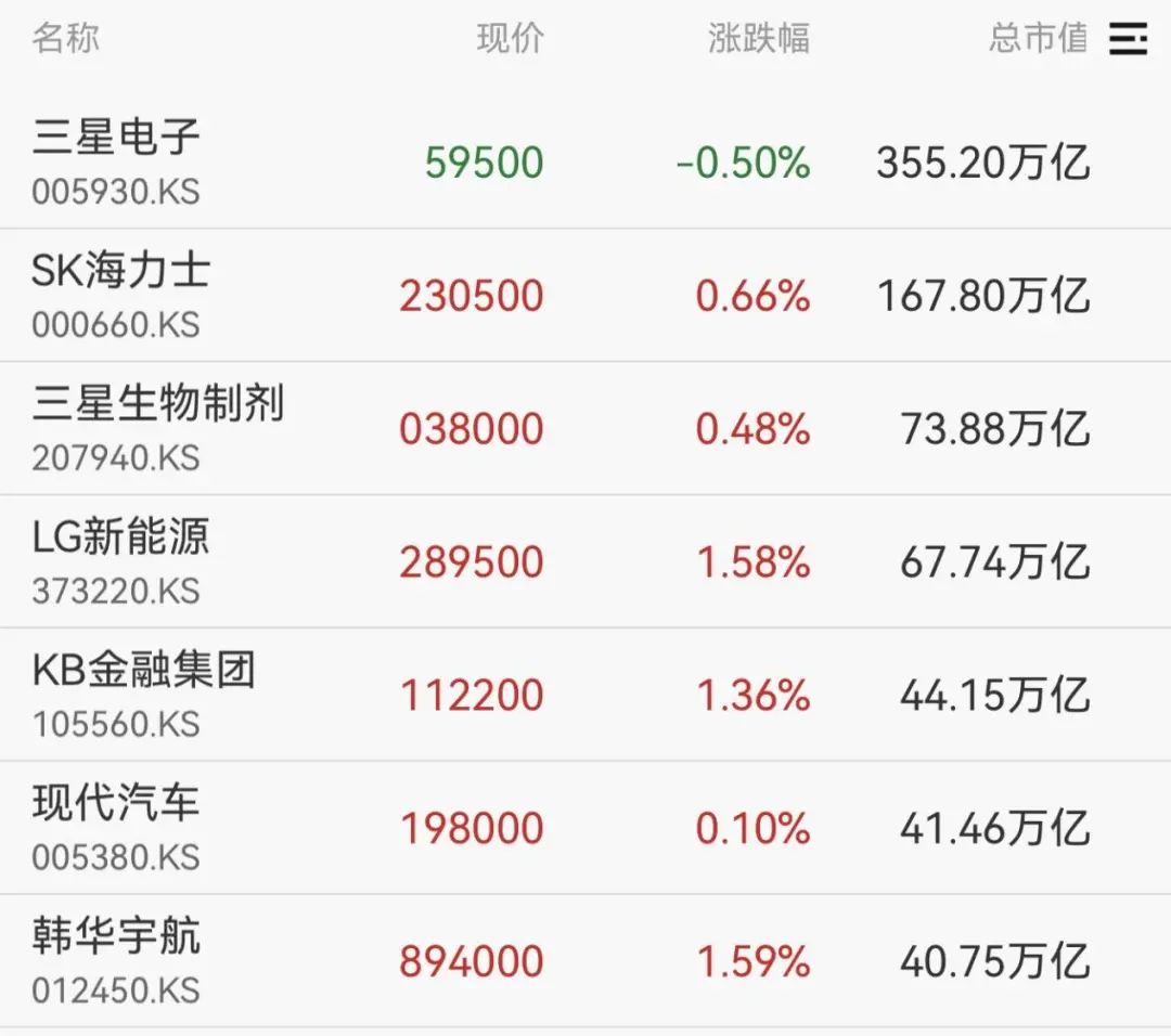 个股方面,三星电子跌0.5%,总市值为355.2万亿韩元,而SK海力士走高。