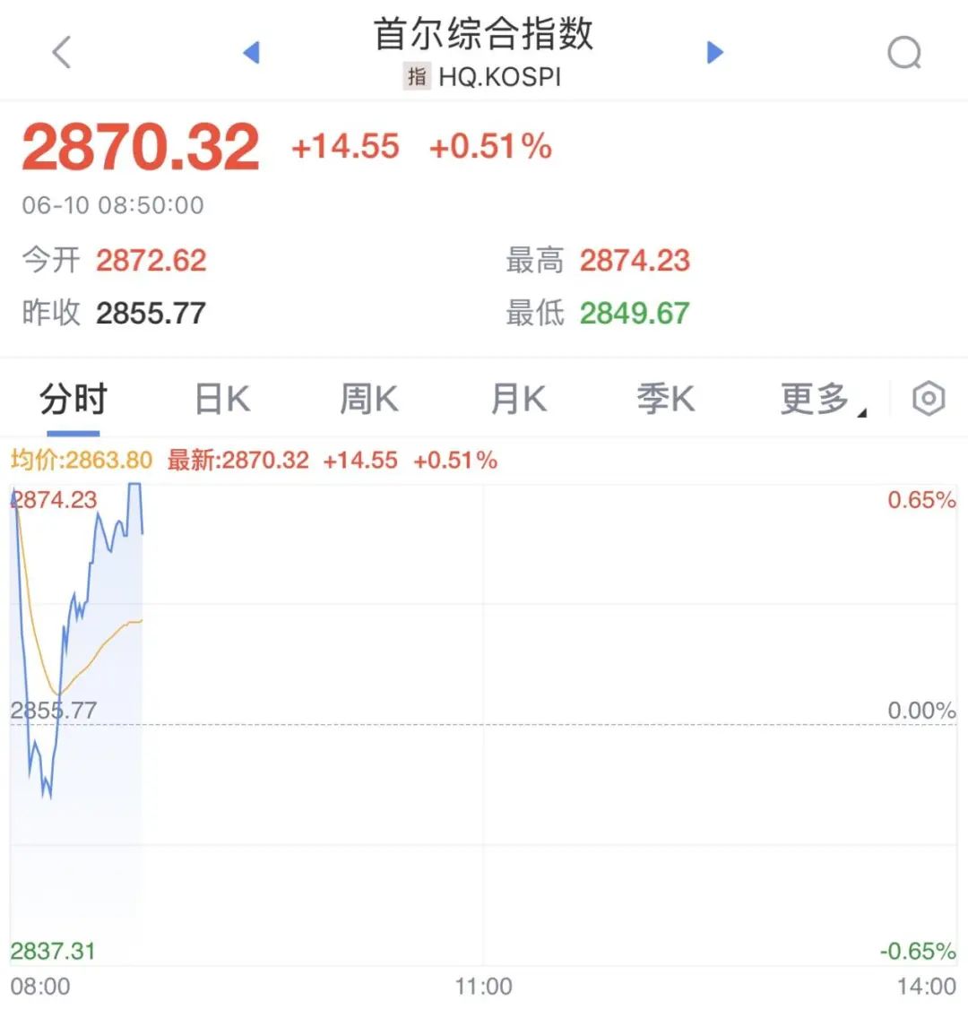 此外,韩国KOSPI指数盘中短线下挫,随后震荡拉升。截至发稿,该指数涨0.51%,至2870.32点。
