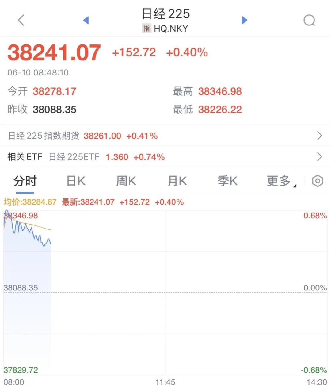 6月10日早间,日本股市高开后震荡调整。截至发稿,日经225指数涨0.4%,报38241.07点。