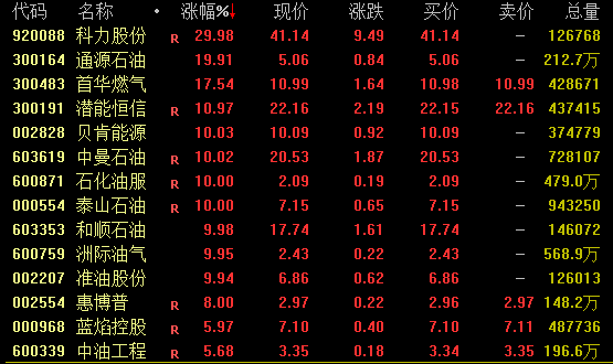 石油板块盘中大幅拉升,截至收盘,科力股份30%涨停,通源石油20%涨停,潜能恒信(300191)涨超10%,贝肯能源(002828)、和顺石油(603353)、准油股份(002207)等均涨停。