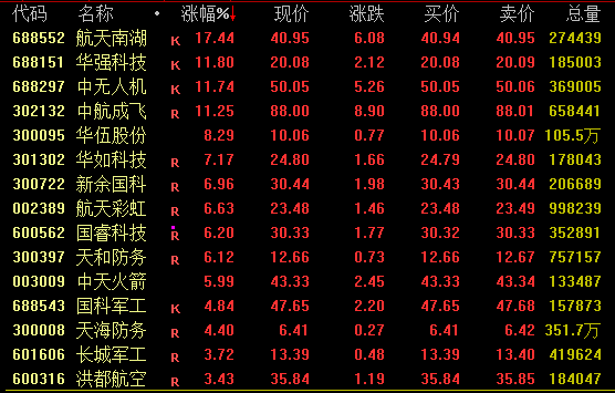 军贸概念股盘中强势上扬,截至收盘,航天南湖涨超17%,华强科技、中航成飞、中无人机涨超10%。