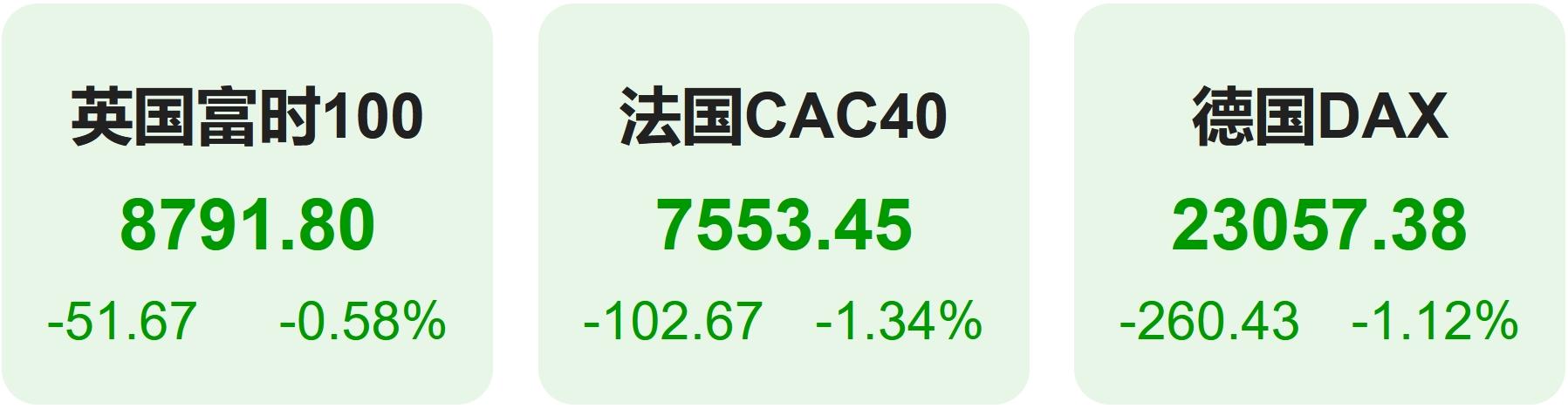 欧洲股市方面,英国富时100指数小幅下跌0.58%,报8792点。法国CAC40指数下跌1.34%,报7553点。德国DAX指数下跌1.12%,报23057点。