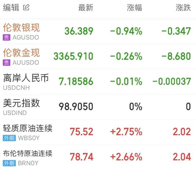 因投资者权衡美国通胀和中东局势,现货黄金小幅下跌,伦敦金最终收跌0.16%,报3369.05美元/盎司;伦敦银最终收跌0.91%,报36.4美元/盎司。