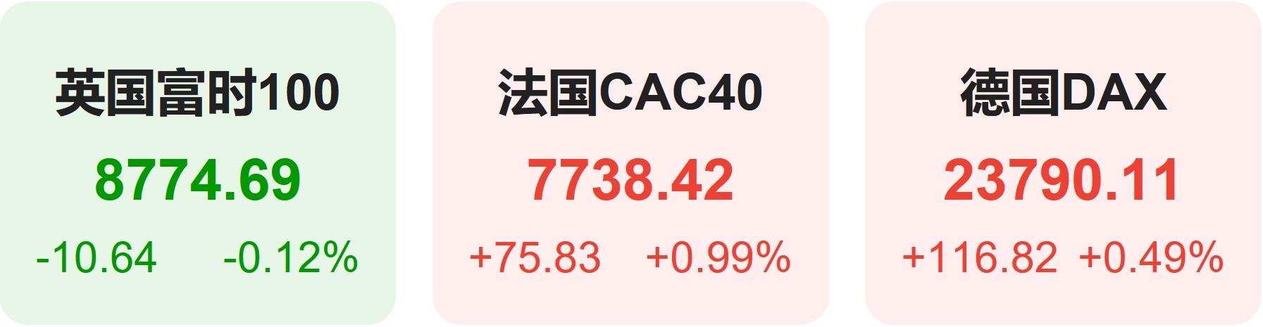 欧洲股市方面,英国富时100指数小幅下跌0.12%,报8775点。法国CAC40指数小幅上涨0.99%,报7738点。德国DAX指数小幅上涨0.49%,报23790点。