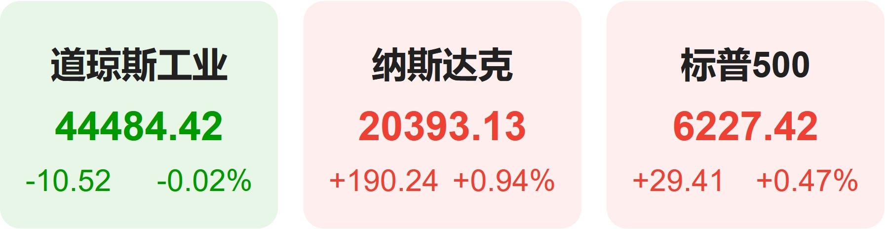 截至收盘,标普500指数涨0.47%,报6227.42点;道琼斯指数跌0.02%,报44484.42点;纳斯达克指数涨0.94%,报20393.13点。其中标普500指数和纳指在短暂回调之后,双双刷新历史收盘新高。