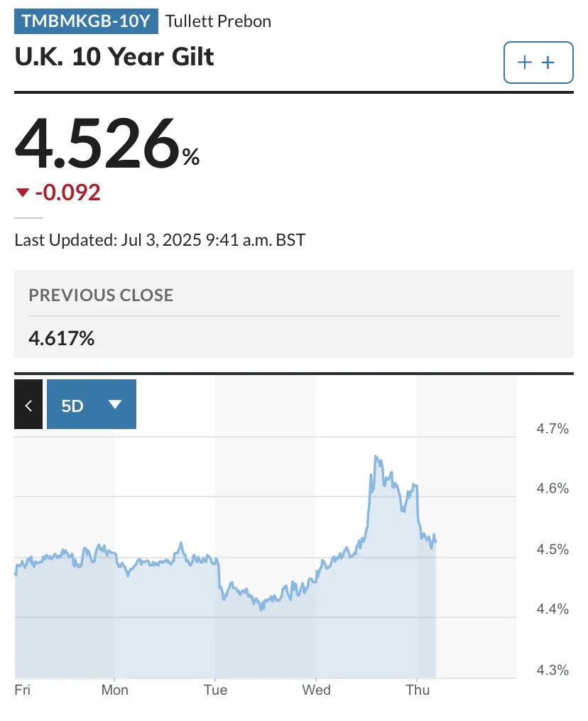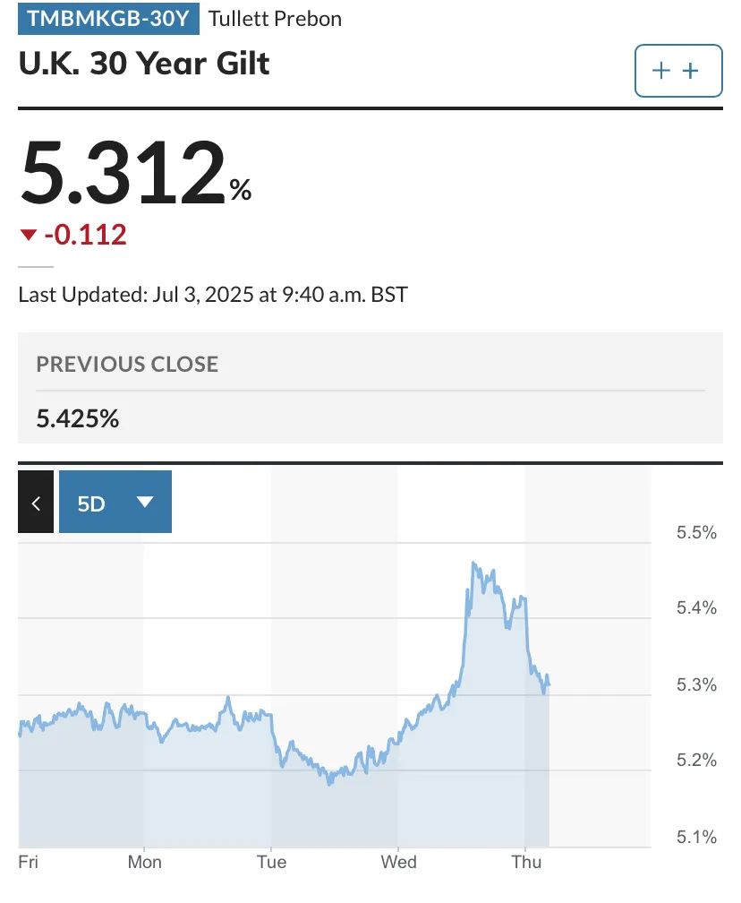 消息面上,英国执政党内部矛盾加剧了财政压力。当地时间7月1日,英国政府大幅缩减原计划的福利削减方案。英国财政大臣蕾切尔·里夫斯(Rachel Reeves)辞职的猜测持续发酵。