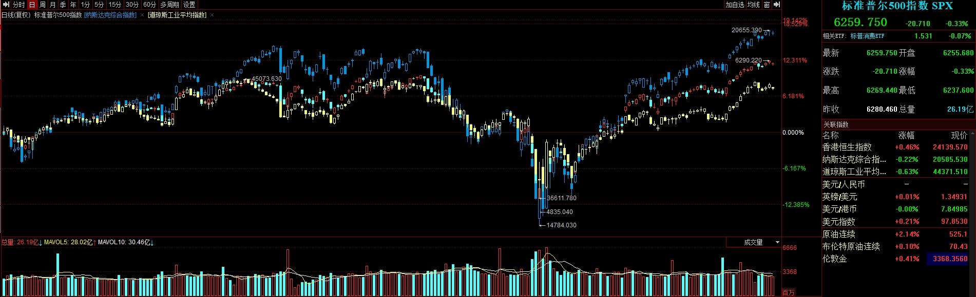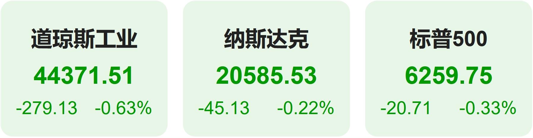 截至上周五收盘,标普500指数跌0.33%,报6259.75点;道琼斯指数跌0.63%,报44371.51点;纳斯达克指数跌0.22%,报20585.53点。