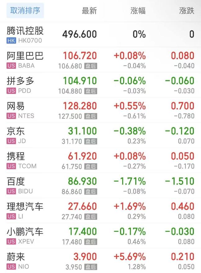 上周五,热门中概股方面,腾讯控股(港股)涨0.00%,阿里巴巴涨0.08%,拼多多跌0.06%,网易涨0.55%,携程涨0.08%,百度跌1.71%,理想汽车涨1.69%,小鹏汽车跌0.17%,蔚来涨5.69%。