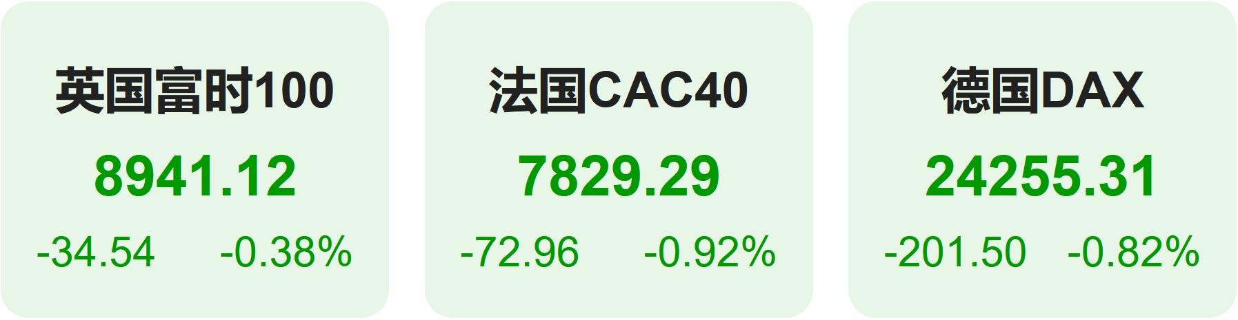 上周五,欧洲股市方面,英国富时100指数小幅下跌0.38%,报8941点。法国CAC40指数小幅下跌0.92%,报7829点。德国DAX指数小幅下跌0.82%,报24255点。