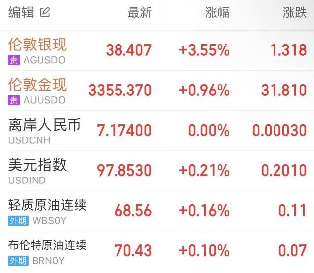 由于特朗普宣布更多关税信函后避险情绪升温,现货黄金连续第三日走高,伦敦金收涨0.95%,收报3355.37美元/盎司;现货白银涨势更加显著,伦敦银收涨3.52%,报38.407美元/盎司,创2011年9月以来新高。