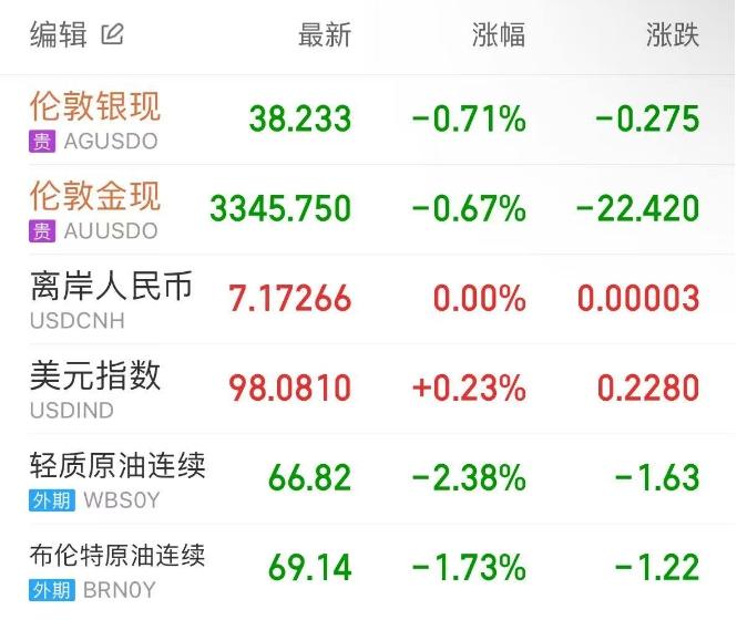现货黄金高开低走,盘中再创三周新高后回吐日内全部涨幅,伦敦金最终收跌0.32%,收报3344.64美元/盎司;现货白银一度站上39关口,再创2011年9月以来新高,随后急转直下,伦敦银最终收跌0.49%,报38.519美元/盎司。