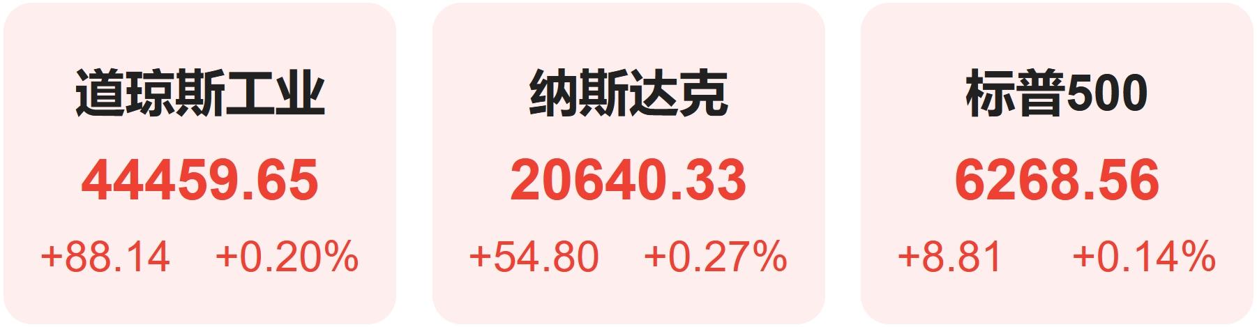 截至收盘,标普500指数涨0.14%,报6268.56点;道琼斯指数涨0.20%,报44459.65点;纳斯达克指数涨0.27%,报20640.33点。