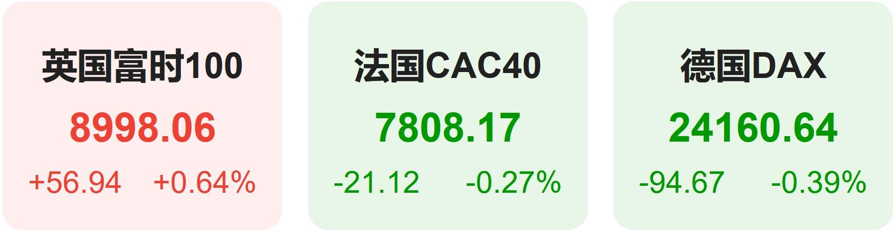 欧洲股市方面,英国富时100指数小幅上涨0.64%,报8998点。法国CAC40指数小幅下跌0.27%,报7808点。德国DAX指数小幅下跌0.39%,报24161点。
