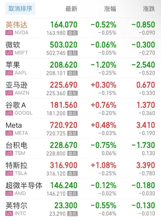 热门美股中,英伟达跌0.52%,微软跌0.06%,苹果跌1.20%,亚马逊涨0.30%,谷歌C涨0.83%,谷歌A涨0.76%,Meta涨0.48%,台积电跌0.75%,特斯拉涨1.08%,超微半导体跌0.12%,英特尔跌0.56%。